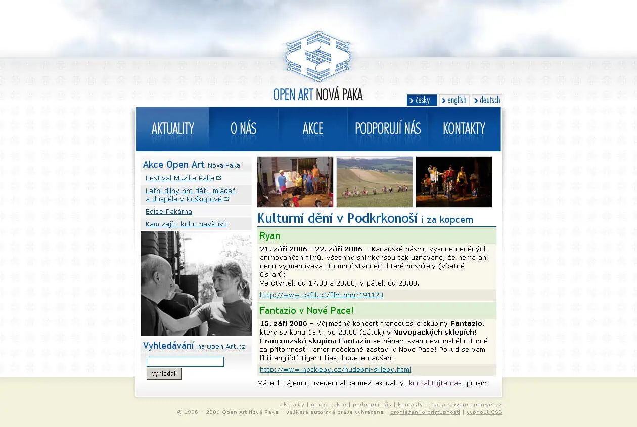 Náhled webu z 23. 6. 2001: https://web.archive.org/web/20010723194504/http://www.open-art.cz:80/